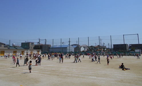 文字通り雲一つない晴天の中、多くの児童が外に出て遊んでいました。