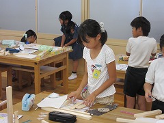 簡単な完成予想図を書き終え、のこぎりの作業がスタートしました。木材に引いた線に沿ってまっすぐに切断するのは難しいのですが、多少曲がっても子どもたちは大満足でした。しばらくすると、友達と協力して切ったり、難しい斜め切りに挑戦したりと、のこぎりを上手に使いこなす様子が見られました。最後は勢いよく切りすぎて切断した木片がポ~ンと飛んで行ってしまうほどでした。安全に気をつけて行うことができたのこぎりでした。