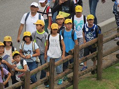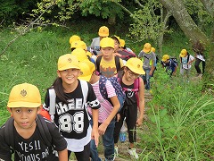部屋の点検を受け退所式を行い、大きな荷物をバスに積み込んだ後にハイキングに行きました。ハイキングは、途中から山道に入ります。前日の夜の雨で、少々ぬかるんでいる場所もありましたが、全員が歩ききりました。最後の展望台からは、宿泊していた少年自然の家の屋根が木々の上に小さく見えました。