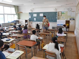写真のように半数の児童(Aグループ)が登校しています。担任の先生やクラスメイトとは、始業式以来の顔合わせとなります。5月26日から29日までが分散登校です。