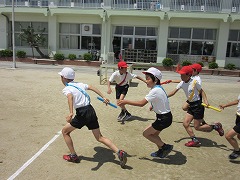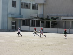 赤白2チームずつの4人でスタートです。低学年は本気で走りましたが、高学年は本番のお楽しみということで、力を入れずに走りました。やがて、アンカーになると先頭の子が徐々に速度を落とし、4人が仲良く並んでゴールに入ってきました。(それを見ていた教室の子たちからは、「追いついた!どのチームが勝つのか?」という実況がありました♪)リレーの練習もわずか2回しかありません。今日の練習を本番までしっかり覚えていてくださいね。