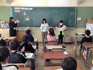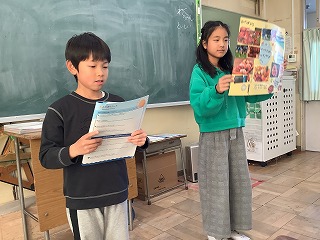 大学生のボランティアさんのお話のあと、冬休みの過ごし方について話がありました。①自転車に乗るときはヘルメットをかぶること②子どもだけでゲームセンターに行かないこと③児童館などの施設は一般の人も使うのでマナーを守ること④お金の貸し借りをしないことを特に心がけて、楽しく安全な冬休みを過ごしてください。