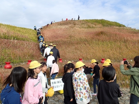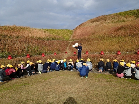 青塚古墳では、説明を聞いたり特別に古墳に登らせていただいたりして学習しました。
