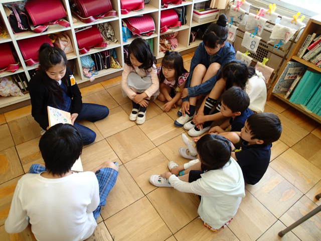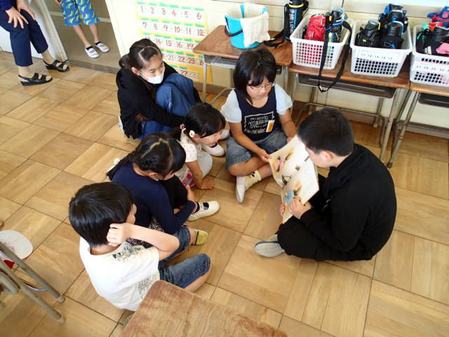 1年生は、身を乗り出して話を聞いたり絵をを見たりしていました。