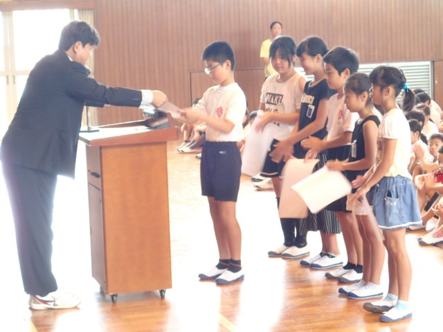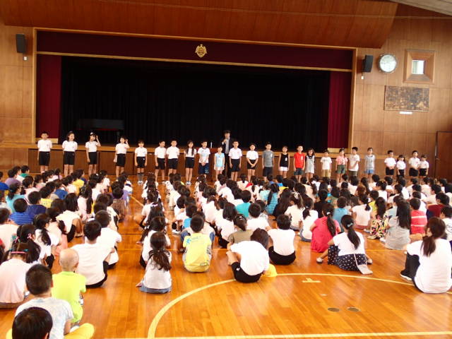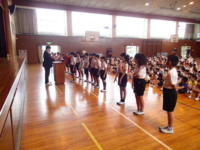 朝礼では、始めに理科の自由研究への応募で、優秀だった人の表彰が行われました。