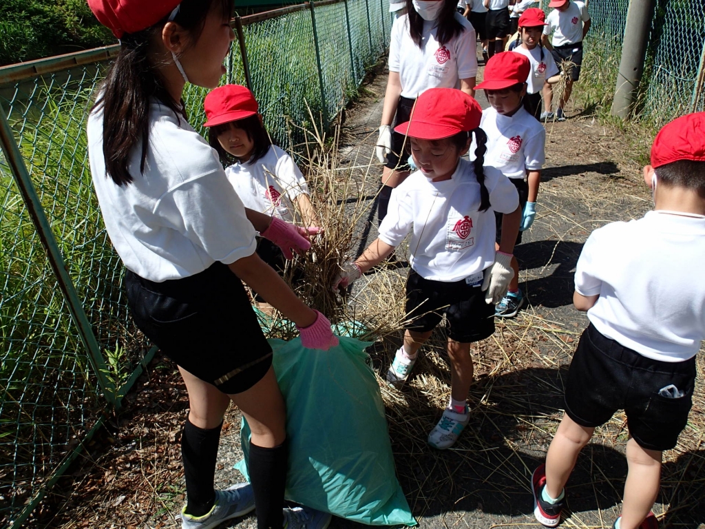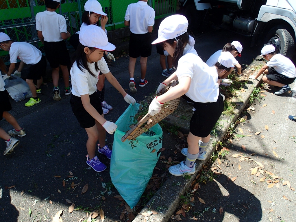青空の下、全校児童が3つの区域の分かれて、ペア学年で清掃作業を行いました。
