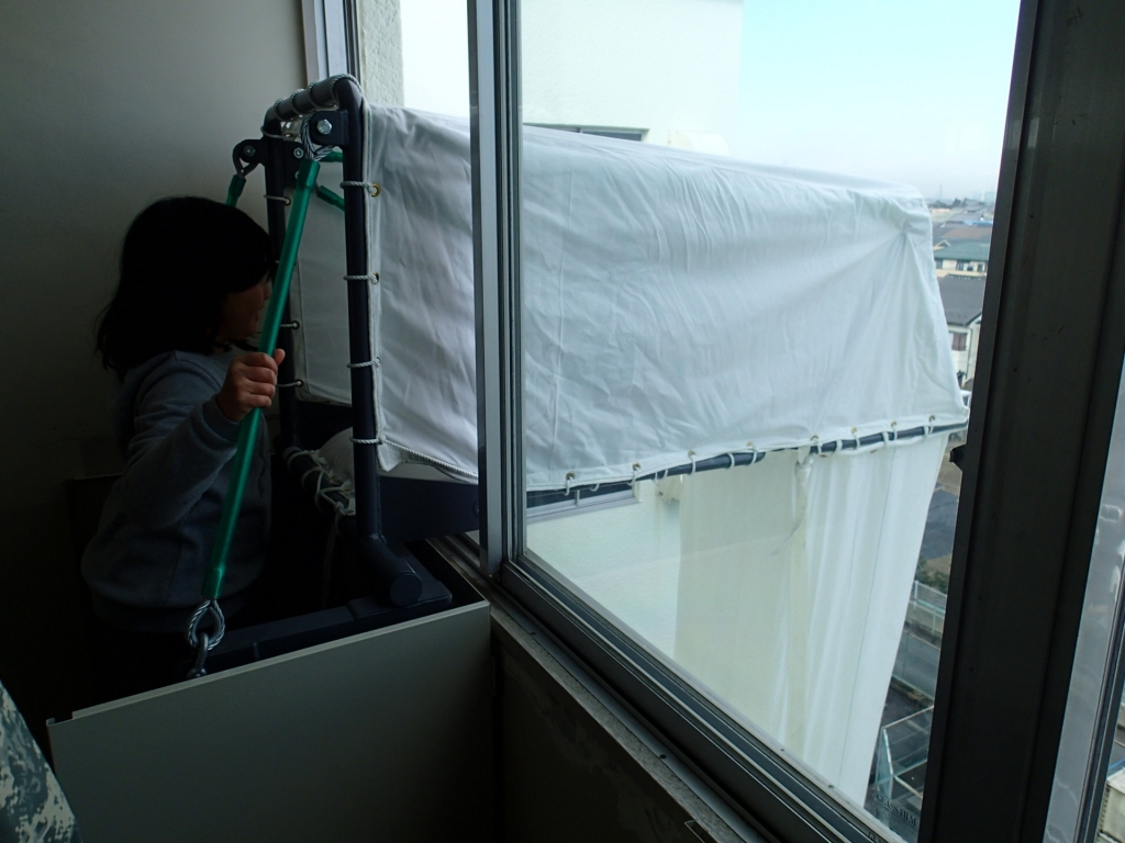 防火シャッターを下ろした状態で、運動場に避難しました。