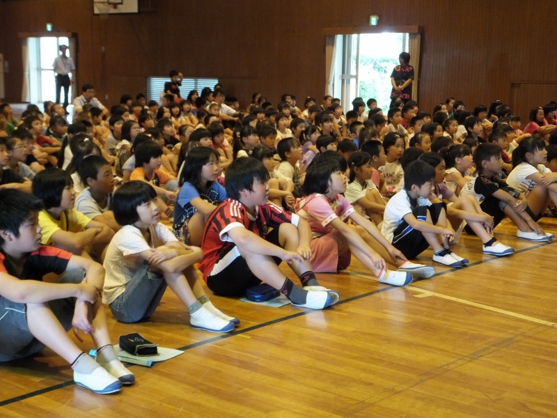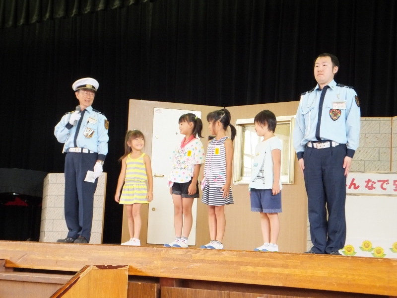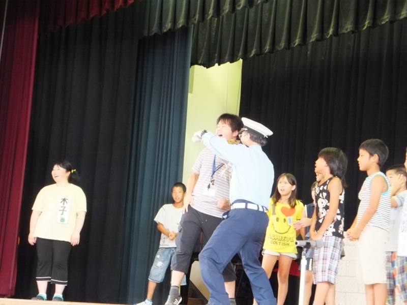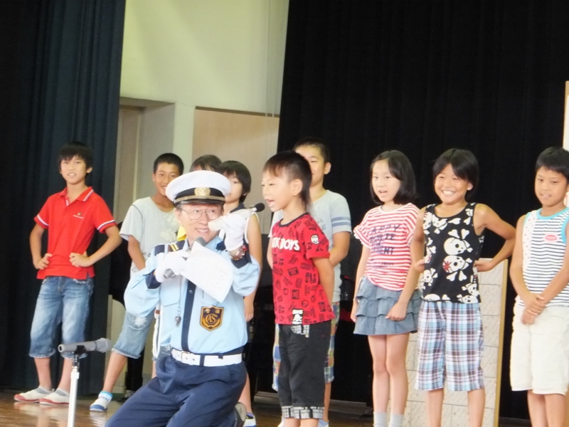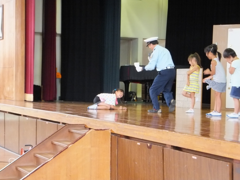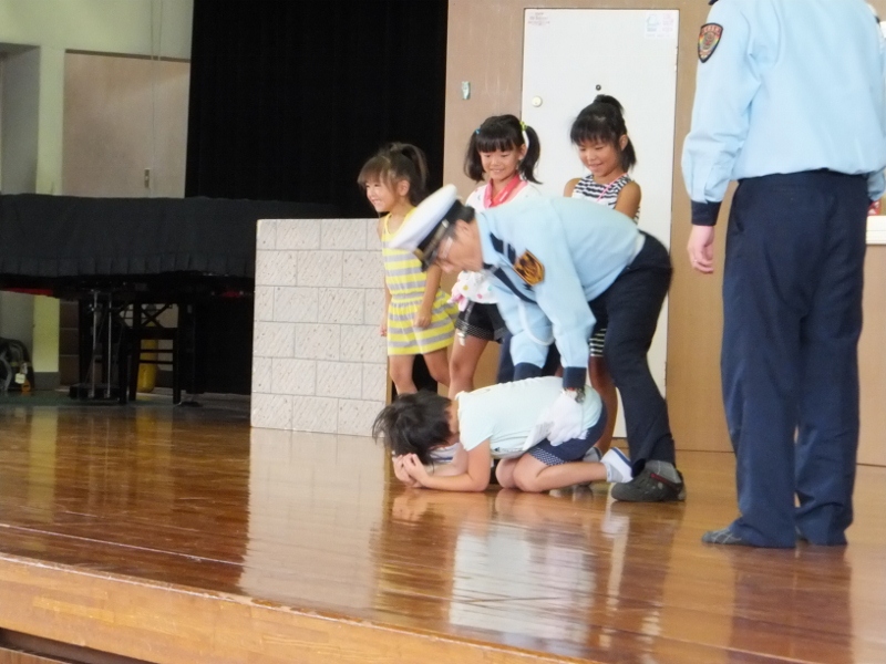不審者、通り魔、連れ去りなど、子どもたちの周りには危険がいっぱいです。この日は、中部安全サービス保障の方々を講師として招き、「おまわりくん」防犯教室を開きました。連れ去りに合わない3つの約束を学んだ後、連れ去りから身を守るための“亀さん”の実技を学びました。代表に児童が、講師が扮した“不審者”を相手に、実技訓練もしました。この日の学びを生かし、皆、安全な夏休みを過ごしてほしいと思います。