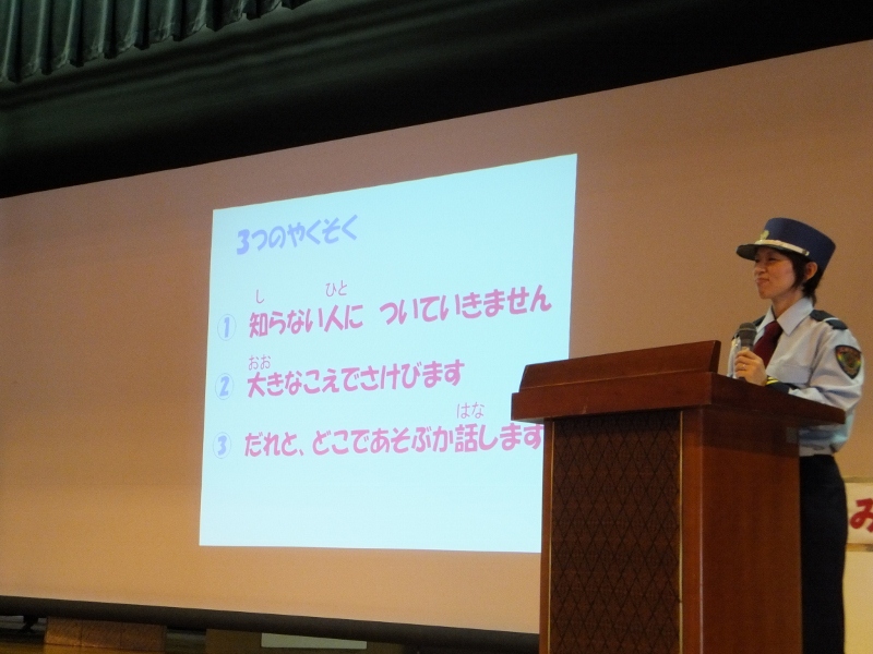 プロの講師を招いての防犯教室 皆、真剣な表情で聞き入る 連れ去りに合わない3つの約束