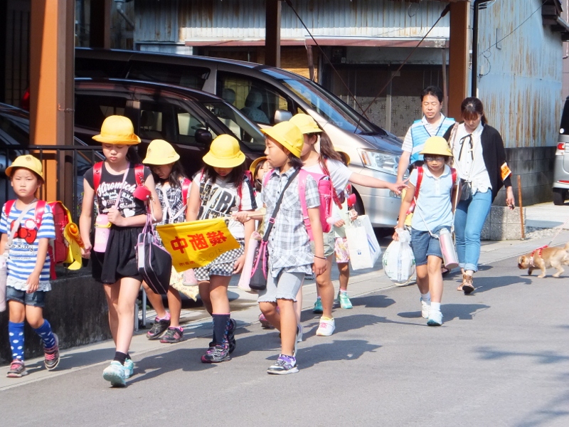 保護者の方に見守られて登校する児童 教室いっぱいの参観者(廊下にも) 調べ学習に取り組む子どもたち