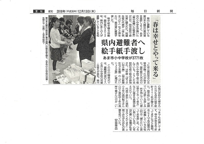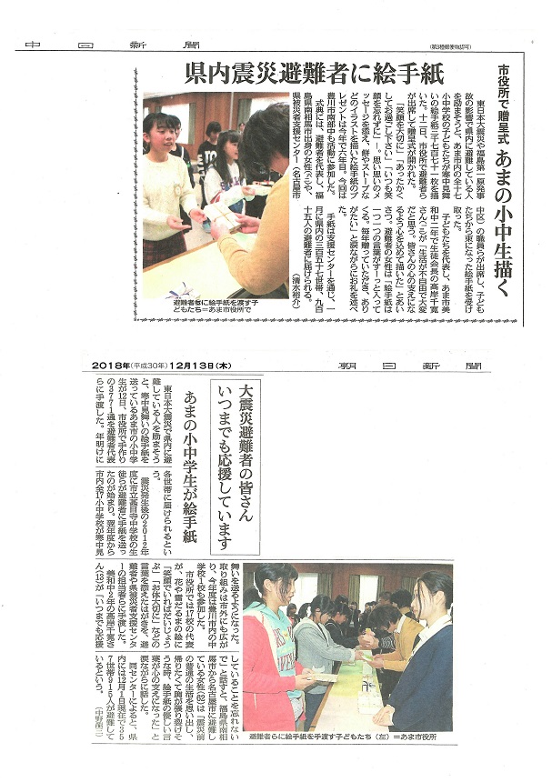 12月12日(水)午後、あま市役所で、東日本大震災や福島第一原発事故の影響で、愛知県内に避難されている方へ寒中見舞いのはがきを贈る、贈呈式が開かれました。
