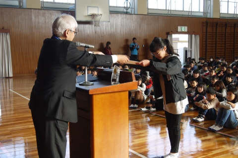 卒業式を前にして、一足先に6年生の修了式を行いました。代表児童が修了証を受け取り、修了式が無事済んだところで、養護教諭から成長の記録のプレゼントがありました。成長の記録カードは、身長が6年間で伸びた分と同じ長さのリボンが結んであり、ほどいてみると、予想以上の長さでびっくり!大きくなったんだね。