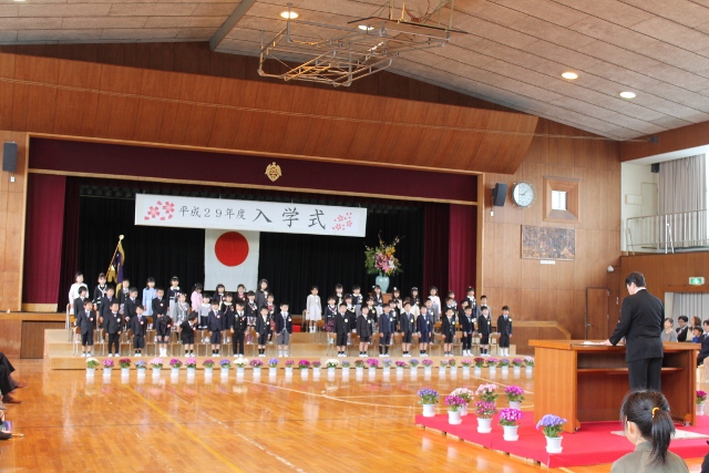 新1年生54名が元気よく返事をし、入学認定を受けました。校長先生からは、小学校生活を始めるにあたって①あいつさつをしよう、②けじめある生活を送ろう、③歌声を響かせよう、④一生懸命掃除しようの四つのめあてを聞きました。緊張する中、落ち着いた態度で式に参加し、学級でも担任の先生の話もきちんと聞くことができました。すばらしいスタートをきることができました。