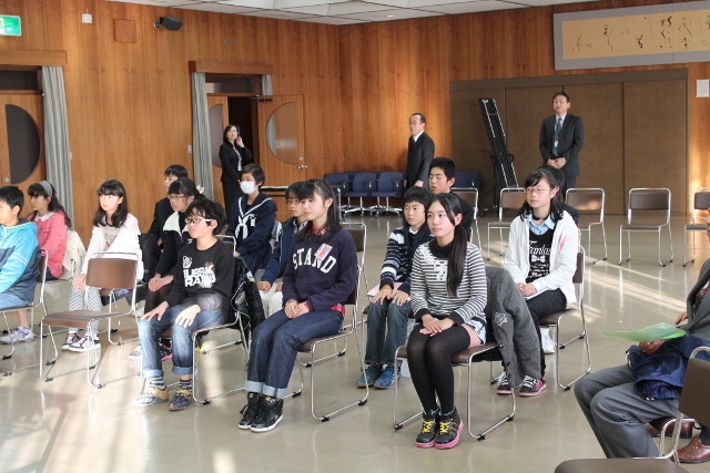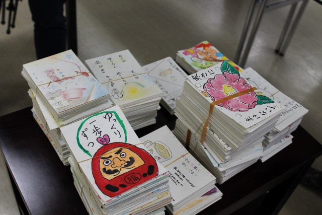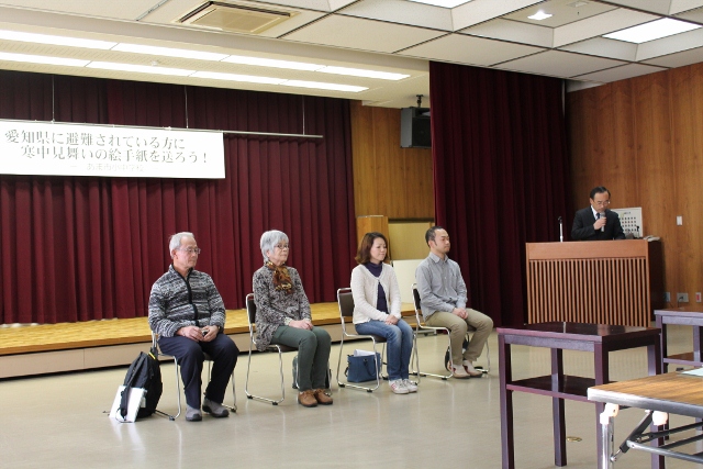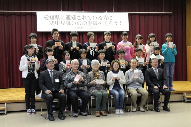 東日本大震災から3年が過ぎましたが、今なお、避難生活を余儀なくされている方もたくさんみえます。この愛知県にも478世帯が避難されているそうです。そんな方々を励まそうと、あま市では昨年度より、「愛知県に避難されている方に寒中見舞いの絵手紙を送ろう!」活動に取り組んでいます。本校でも、全校児童が心を込めた絵手紙を描いてくれ、この日は、被災者の代表の方に、絵手紙を送る会が開かれ、児童会長が代表で出席しました。絵手紙を手渡すと、「閉ざされかけた心を、この温かい手紙のおかげで、もう一度開かせることができました。ありがとう」と、心から喜んでくださいました。