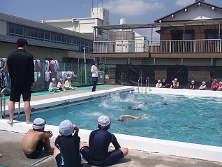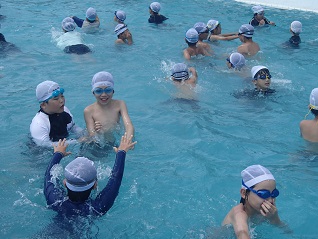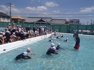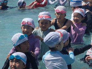 子どもたちは、うなぎになったり、カニになったりしながら水慣れを楽しみました。先生がワニになるお手本を見せると、子どもたちから大きな拍手が贈られました。