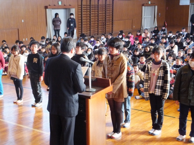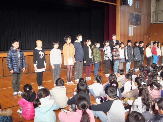 寒い日が続いていますが、この日の朝も全校児童が一堂に会し、朝礼が行われました。三学期の学級員の認証があり、それぞれのクラスで選ばれた学級委員は、校長先生から認証状を受け取り、決意を新たにしていました。