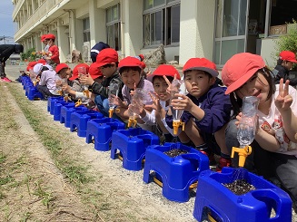 1年生は一人一つ、アサガオを育てています。