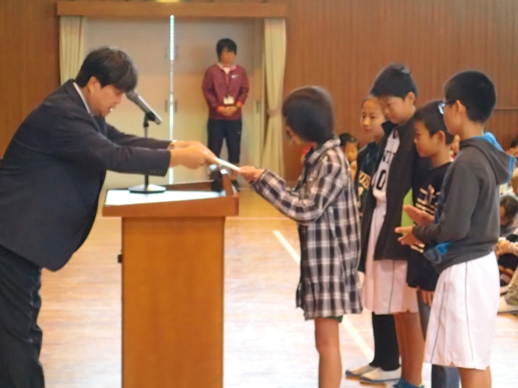 朝礼で、後期児童会役員認証が行われました。