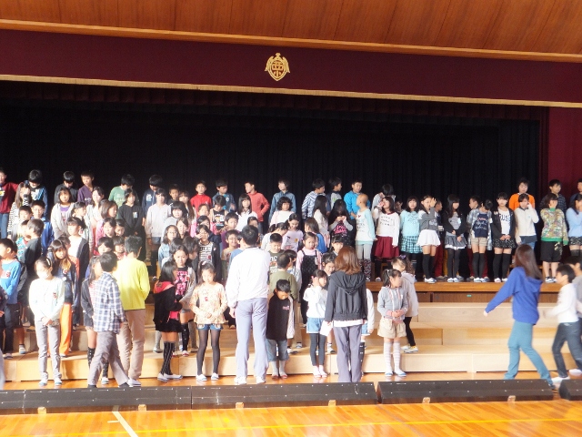11月に入り、学習発表会の練習が熱を帯びてきました。昨年度より実施している「全校合唱」に向けての練習にも力が入ってきました。この日は、隊形移動の練習をしました。演技順の関係で、体育館で下級生が会場に入ってくるのを待っている6年生の姿勢が素晴らしく、会場全体が引き締まった雰囲気での入場となりました。当日の子どもたちの頑張りをご期待下さい。