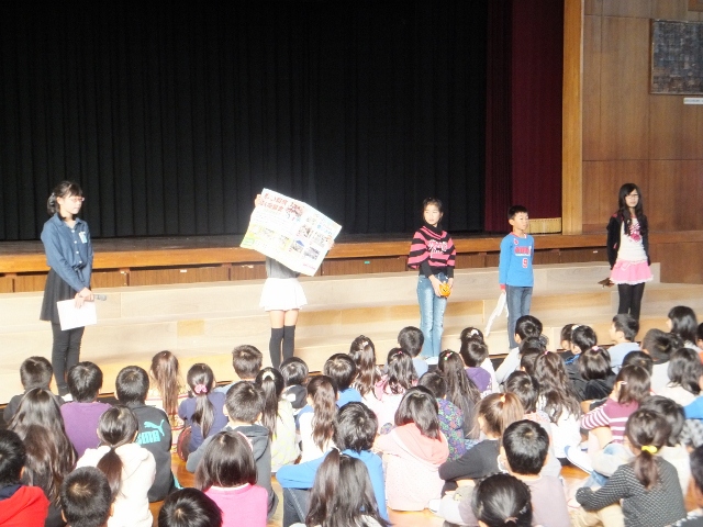 卒業式を前にして、一足先に6年生の修了式を行いました。代表児童が修了証を受け取り、修了式が無事済んだところで、養護教諭から成長の記録のプレゼントがありました。成長の記録カードは、身長が6年間で伸びた分と同じ長さのリボンが結んであり、ほどいてみると、予想以上の長さでびっくり!大きくなったんだね。