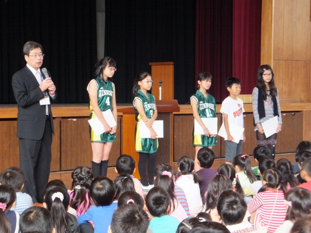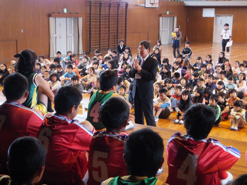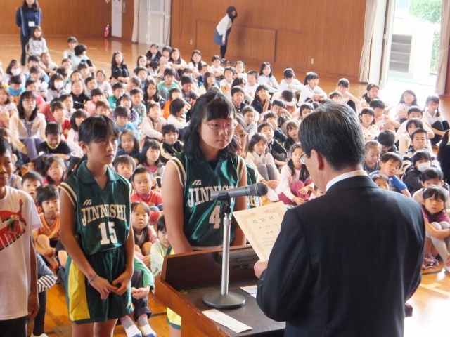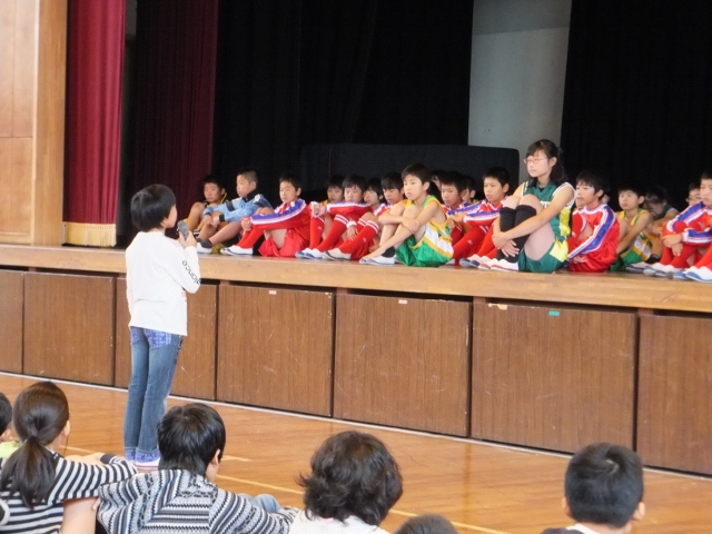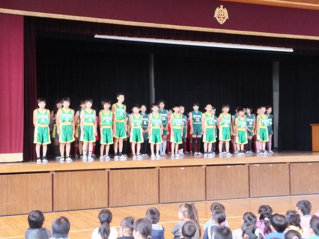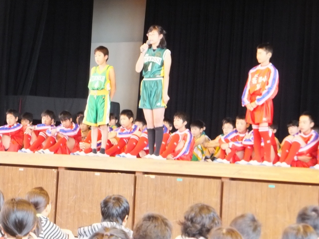 また、23日(木)に予定さている「甚目寺地区サッカーバスケ競技会」に出場する選手の壮行会も行われました。選手一人一人が決意を語った後、それぞれのキャプテンが大会にかける思いを語ってくれました。その後、児童会長と校長先生から激励の言葉が贈られました。