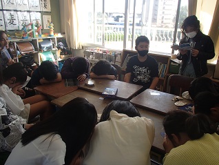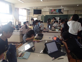 ポケモンのキャラクターを動かすプログラミング中。「どうやったの?」と聞かれて教えてあげる得意な子もいました。
