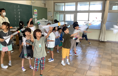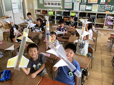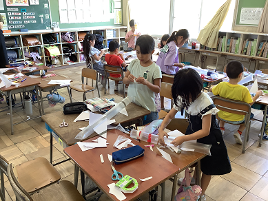 今週はみんなで、ビニールのかさ袋を使って、ビニールロケットを作りました。どうやったらよく飛ぶか考えたり、自分だけのかざりつけや、羽の形を考えたりして楽しみました。実際に飛ばしてみると、子どもたちはとっても楽しそうでした!