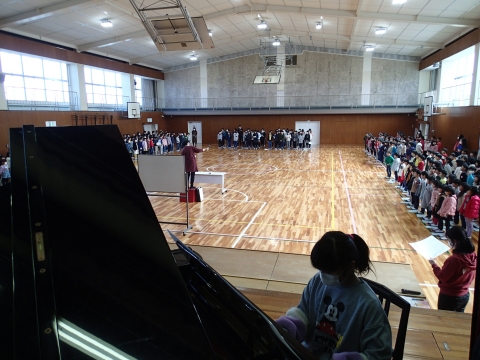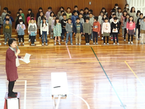 2月12日(水)体育館で堀田みどり先生を講師にお招きし、合唱練習が行われました。1年生から5年生の練習では、高音の出し方や腹筋の使い方を教えていただきました。