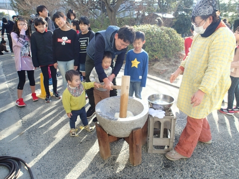 親子約400名が集まり、もちつきを体験したりつきたてのおもちを食べたりしました。