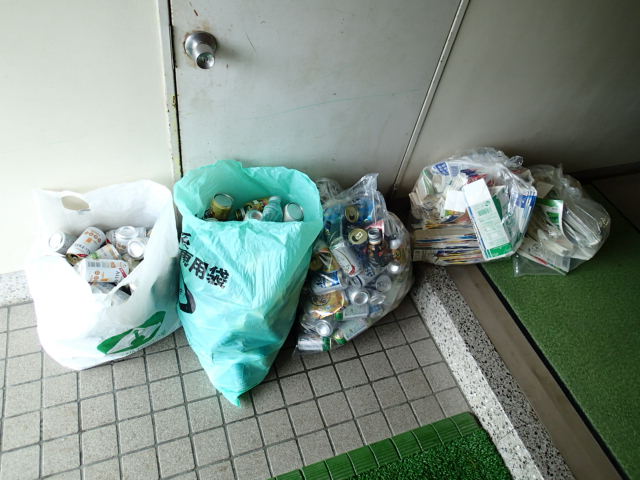 あいにくの雨と5年生の野外活動で不在の中でしたが、3袋のアルミ缶と2袋の牛乳パックが集まりました。
