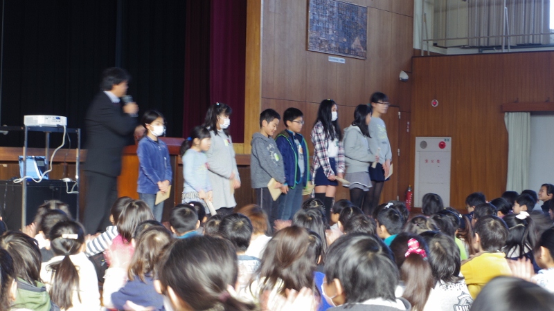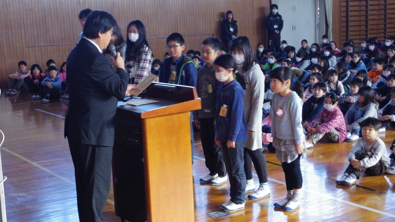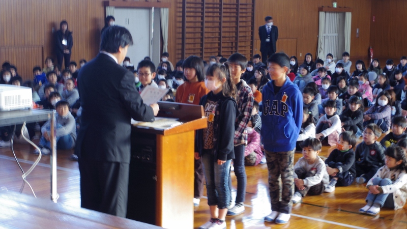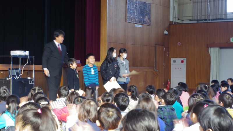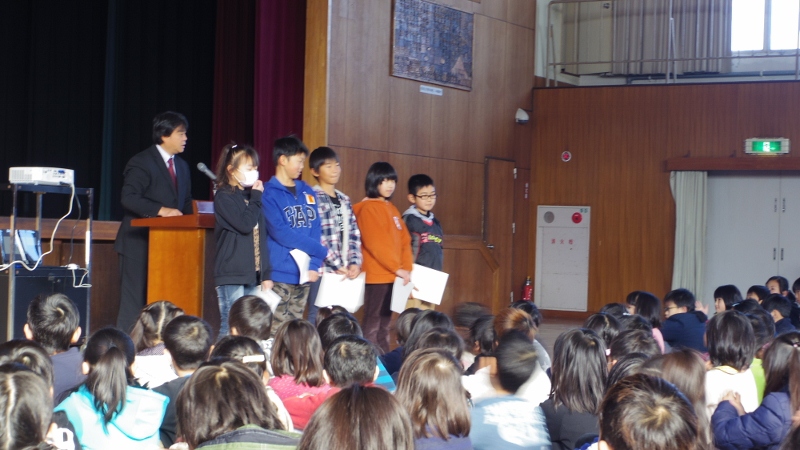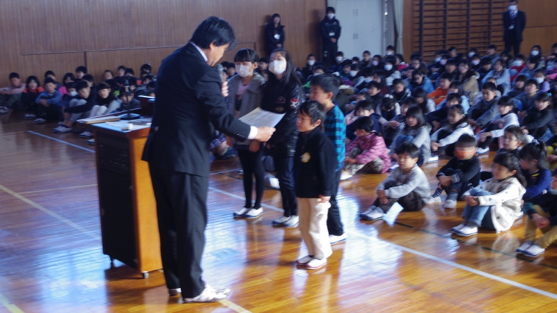 寒い日が続きますが、この日の朝礼では、来年度の児童会役員の認証式が行われました。校長先生から認証状を手渡され、全校の皆から激励の拍手をもらい、決意を新たにしていました。