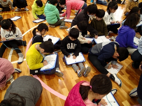 「絆を深めて楽しい思い出を残そう」をテーマに、1年生から6年生全校児童が通学団の班に分かれて、児童会役員が考えたクイズや絵描き歌で遊びました。