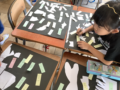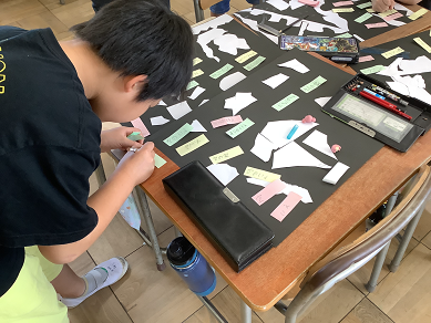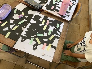 ↓図画工作の鑑賞の様子(友達の作品の名前を当てるクイズ)