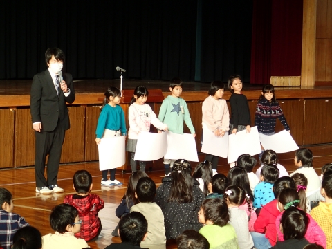 12月21日(金)朝、臨時朝礼「冬休みを迎える会」が行われました。