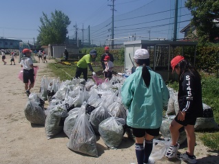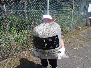 校庭には次々とごみの袋が集まってきました。先生たちと保護者の方とで、草を袋いっぱいにまとめていきました。ざっと数えて85袋にもなりました。「もっとやりたかったなあ」という頼もしい児童の声もありました。