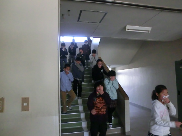 いつ起きるかわからない災害に備え、学校では定期的に避難訓練を実施しています。この日は、4階の家庭科室から出火したと想定して、避難訓練を実施しました。子どもたちは、担任の先生の指示をよく聞き、口や鼻をハンカチで押さえながら、素早く避難することができました。少し残念だったのは、3学期に行った時と比べて、おしゃべりをしている子が多かったように思います。災害から身を守るためには、情報をしっかりとつかむことが大切です。おしゃべりをしていると、そうした情報を聞き漏らす可能性が高く、今後、気をつけてもらいたいと思います。