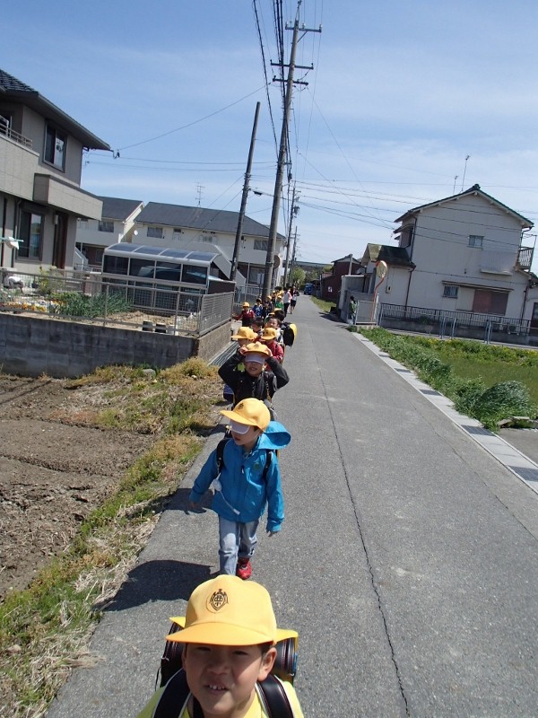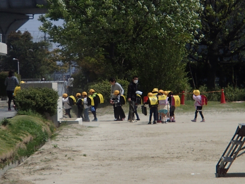入学したばかりの1年生の給食が始まるのは15日(金)です。それまでの間は、お昼前に1年生だけで帰ります。先生たちが手分けして下校に付き添い、出迎えに出ていただいているお家の方々に引き渡します。みんなきちんと一列に並んで、楽しくお話をしながら帰って行きます。