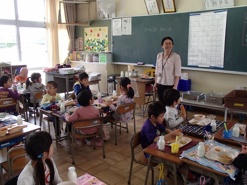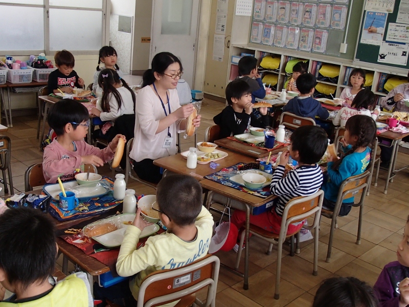 甚目寺給食センターの栄養職員の方が、給食の配膳や会食の様子を視察に見えました。準備ができた後、この日は1年1組の子どもたちといっしょに会食しながら、給食についての子どもたちの声を聞いて下さいました。美味しい給食作りに生かして下さる予定です。