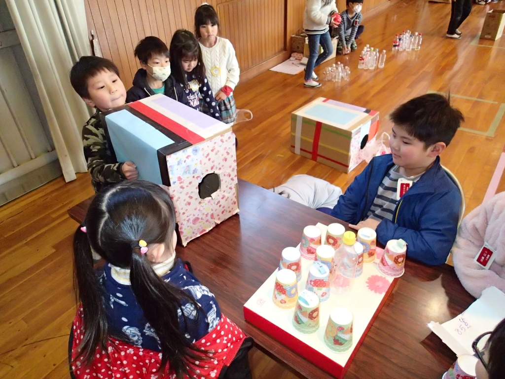1年生は、「空気砲」「輪投げ」「ボウリング」「宝さがし」「カーリング」などで楽しそうに遊びました。