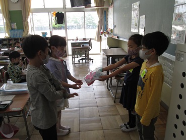 例年だと、2年生がグループをつくって1年生のクラスへアサガオの種を届けるのですが、コロナウィルスの対応も考慮し、今年は学級委員が代表で届けました。