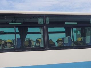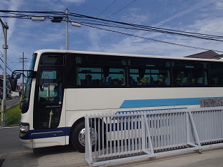 笑顔いっぱいで手を振る4年生。バスが到着するずいぶん前に準備を終えて、わくわくしながら待つ姿が見られました。