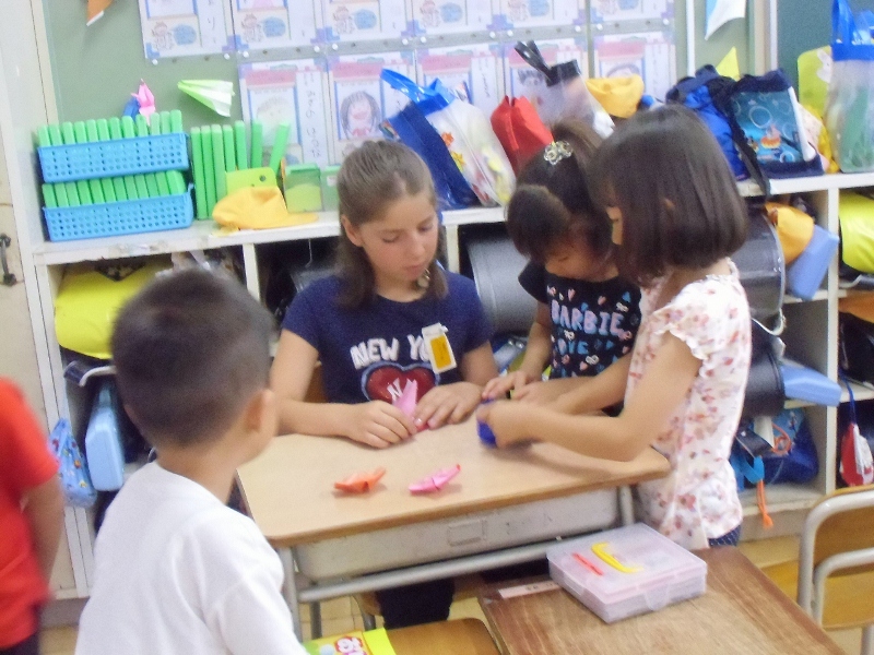 初めての書道に悪戦苦闘           甚西小の子どもたちが優しく教授       折り紙でいろいろなものを折ってみる