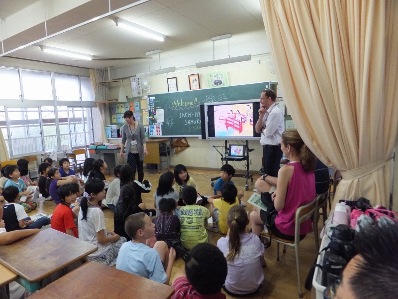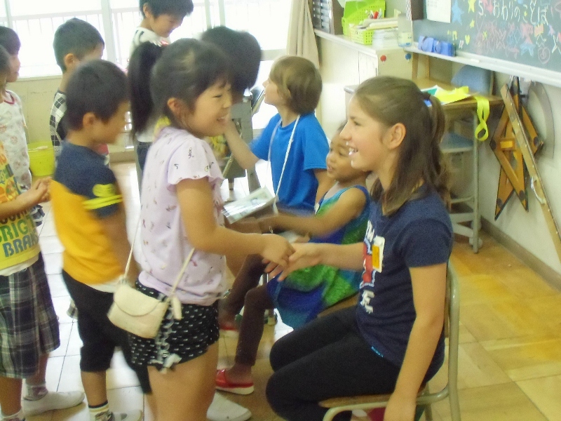 英語版の読み聞かせに挑戦          日本の伝統の歌をいっしょに歌う          休み時間の笑顔でふれあい
