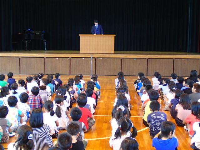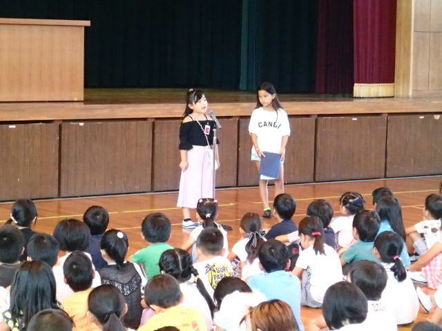 校長先生からは、「2学期も運動会を始めとする、さまざまな活動に笑顔で元気に協力して取り組みましょう」、また「自分の命は自分だけのものではない。命は未来につながるもの。守ったり育んだり、大切にしましょう」との話がありました。