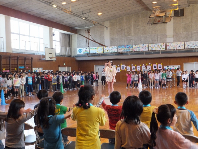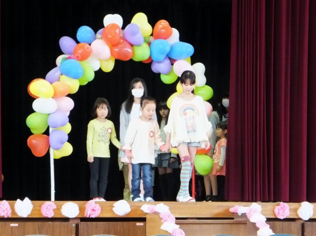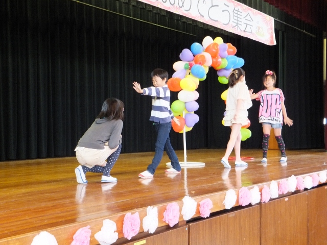 1年生が入学して2週間ほどが過ぎました。この日は、児童会企画の「1年生おめでとう集会」が開かれました。上級生が飾り付けをした体育館に、6年生に手を引かれた1年生を迎え、素敵なひとときを過ごしました。