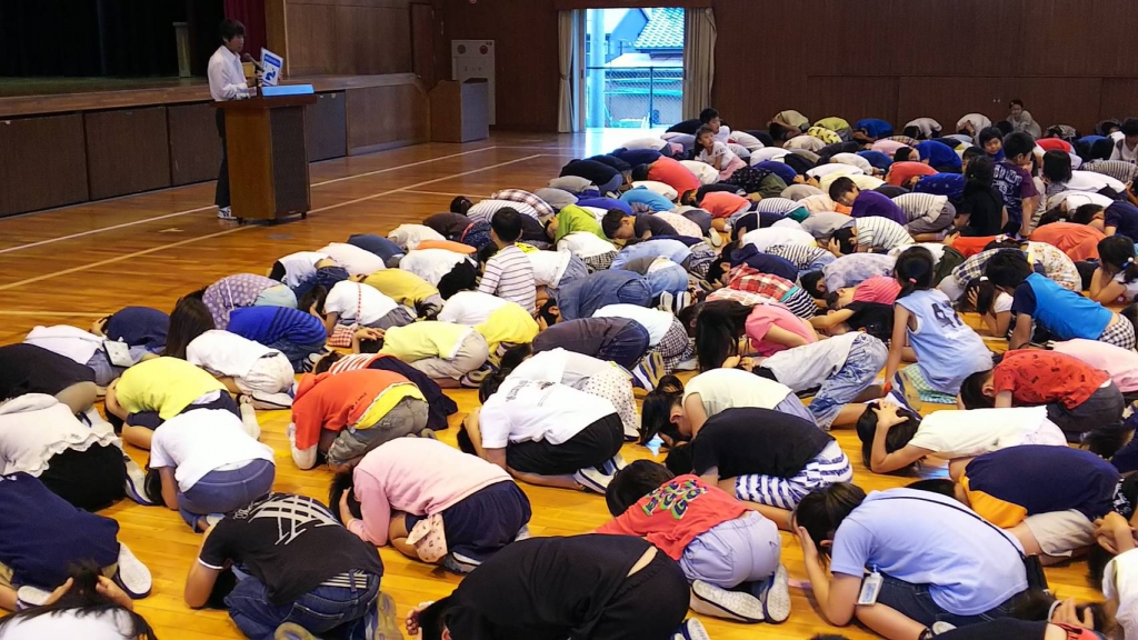朝礼で、地震が起きた際の、避難行動「シェイクアウト」の確認をしました。