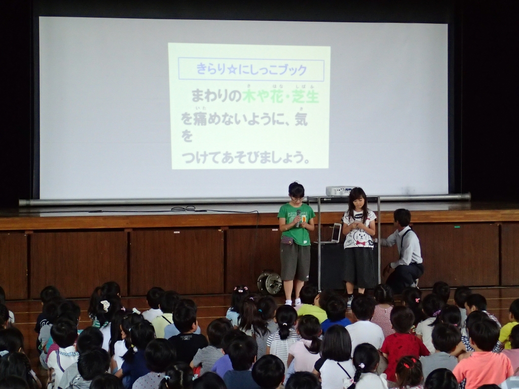その後のミニ集会では、芝生や花壇に入らない等の約束事や、ウサギ「ミルキー」への接し方を全員で確認しました。