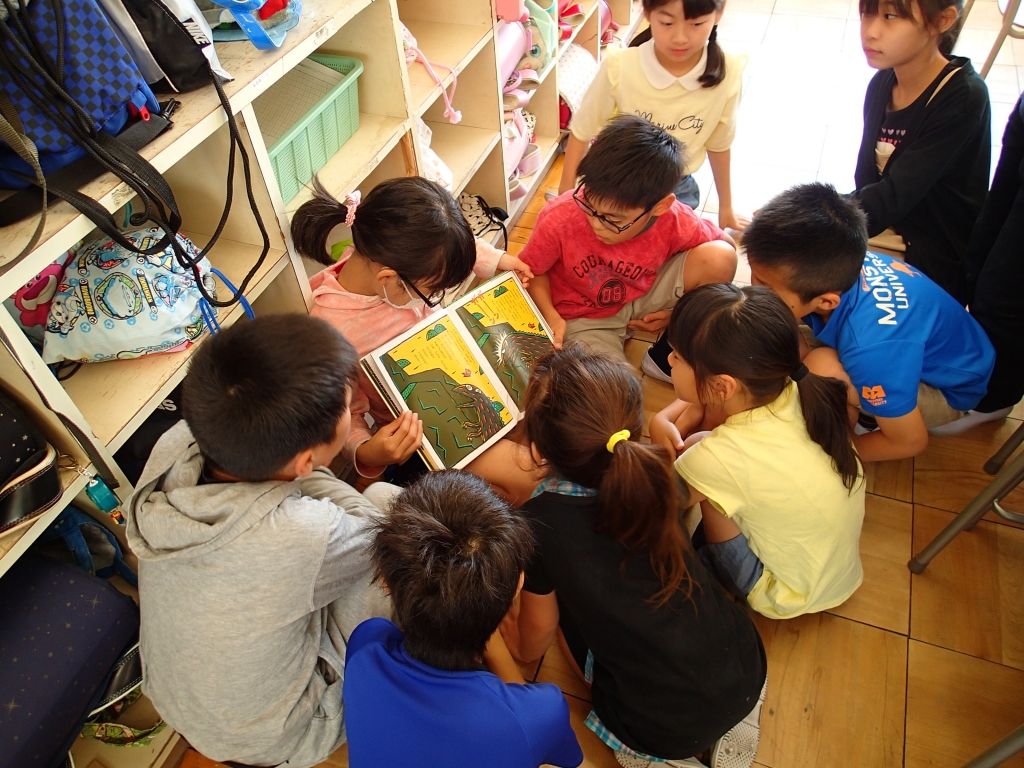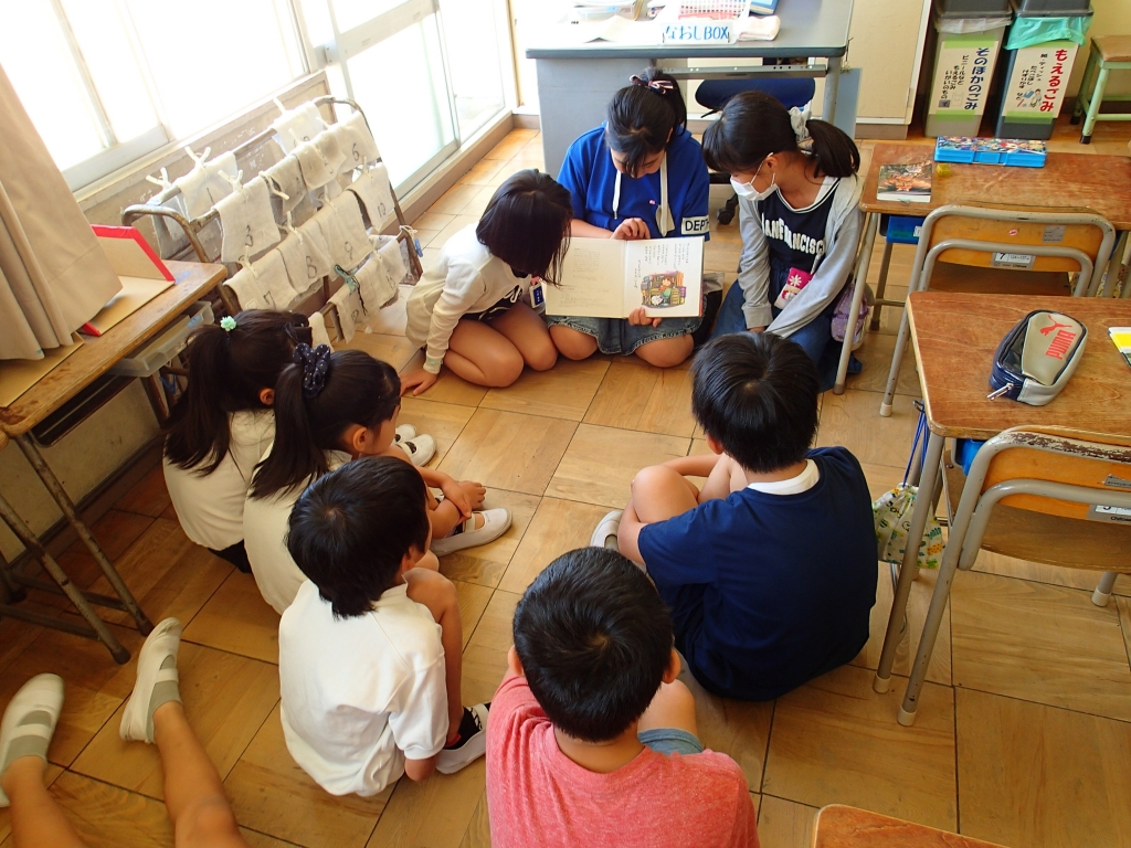 3年生が5年生の教室に出かけたり、5年生が3年生の教室を訪問したりして、用意した絵本を朗読しました。