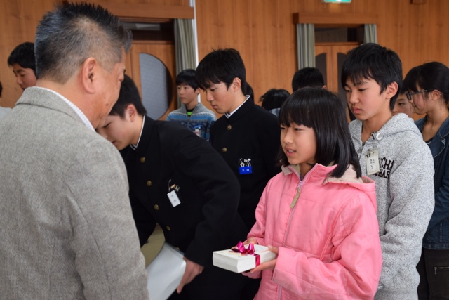 卒業式を前にして、一足先に6年生の修了式を行いました。代表児童が修了証を受け取り、修了式が無事済んだところで、養護教諭から成長の記録のプレゼントがありました。成長の記録カードは、身長が6年間で伸びた分と同じ長さのリボンが結んであり、ほどいてみると、予想以上の長さでびっくり!大きくなったんだね。