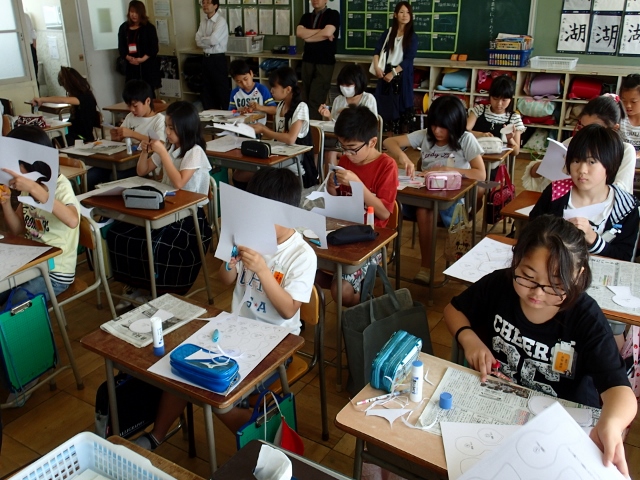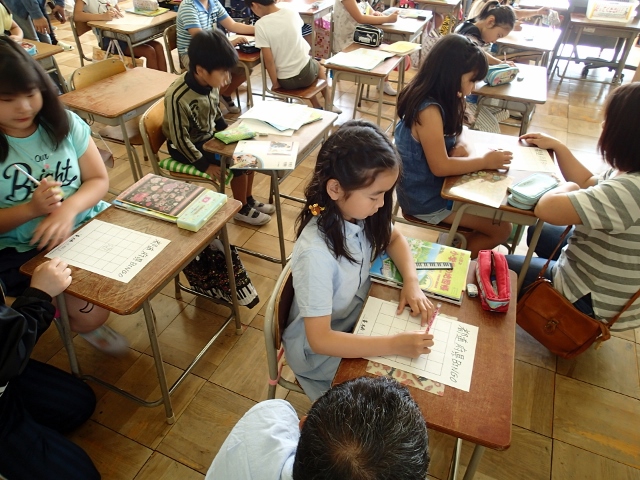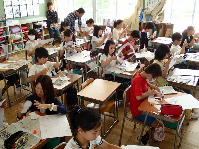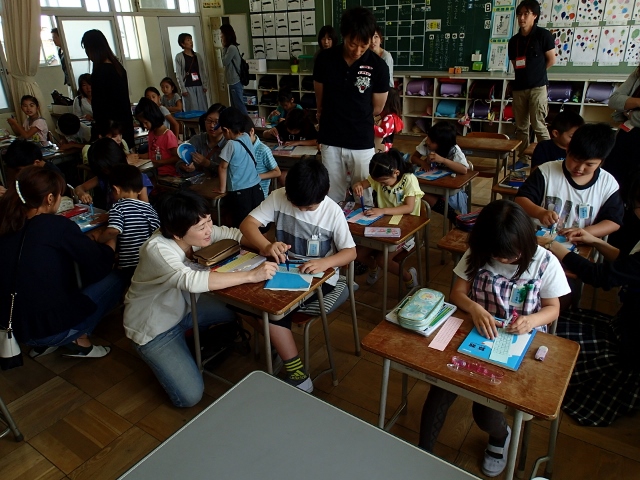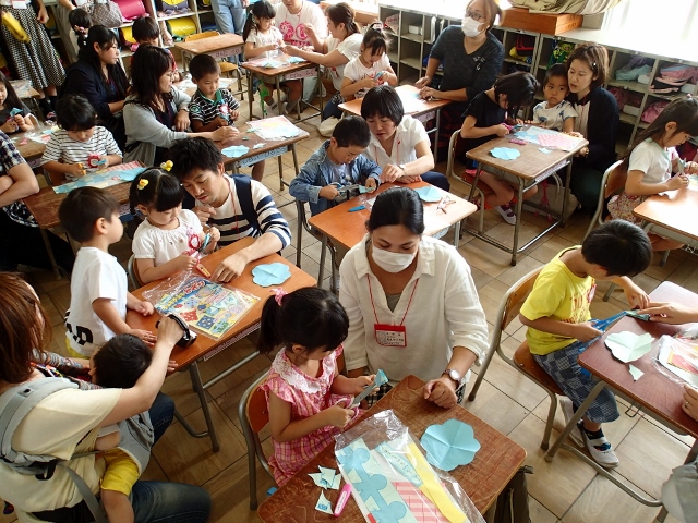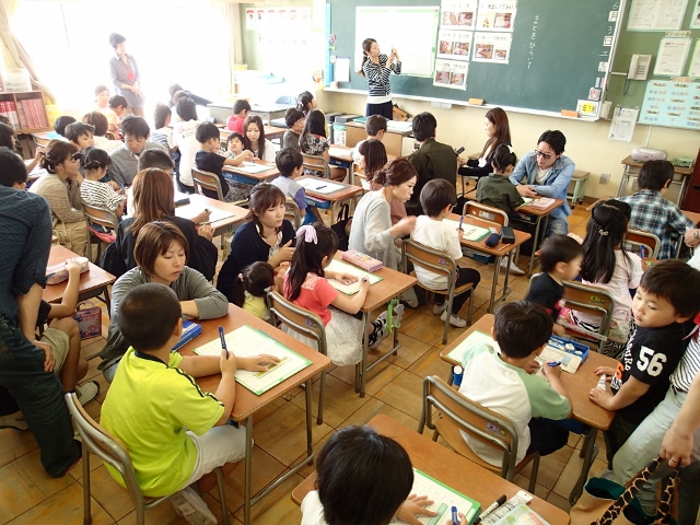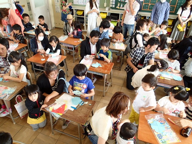 6月3日(土)家族学級が行われました。1限目は「授業参観」で、多くの保護者の方に授業を見ていただきました。休日とあって、お父さんにも来ていただきました。紙をはさみやカッターナイフで切る場面では、親子で協力する場面も見られました。